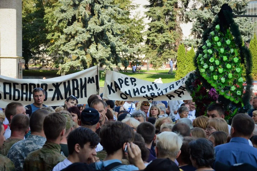 В цей час під стінами мерії було гаряче. За годину до початку сесії на площі перед міськрадою зібрались  мітингарі, які вже кілька тижнів блокують будівництво муніципального кладовища у мікрорайоні Сабарів.  Відомо, що напередодні протестувальники вимагали, аби мер міста Сергій Моргунов приїхав до них на поле для переговорів, однак цього не відбулося. В свою чергу представники мерії пропонували прийти до Моргунова на переговори ініціативною групою. Втім, люди не пристали на цю пропозицію, мотивуючи це тим, що вони – громада, і всі разом мають право та хочуть почути мера міста.   Відтак люди прийшли протестувати під вікна мерії. Сюди вони прийшли траурною процесією  під похоронний марш.