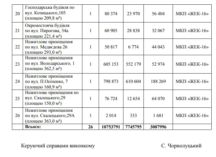 Не лише будівлю по Монастирській,1 рішенням виконавчого комітету Вінницької міської ради від 25.04.2013 року № 940 було передано з балансу МКП «ЖЕК-16» в господарське відання ТОВ «ЖЕО». Також у відання ТОВ «ЖЕО» перейшли ще шість будівель: