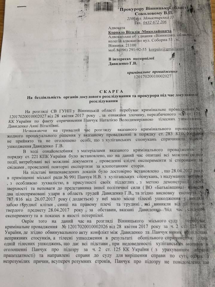 Ганна Давиденко сьогодні подала скаргу до обласної прокуратури на бездіяльність органів досудового розслідування та прокурора під час досудового розслідування. Вона каже, що під час розгляду провадження ще не було жодного процесуального рішення, навіть не оголошено підозру. Давиденко до скарги долучила висновок судово-медичної експертизи про тілесні ушкодження.