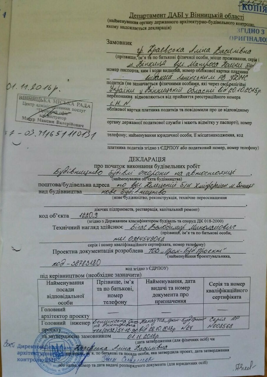 Рішенням виконкому Вінницької міської ради від 27.10.2016 року № 2529 Аліні Краєвській надали вихідні дані – містобудівні умови та обмеження на проектування будівлі охорони на автомобільній стоянці по вул. Келецькій, б/н, незважаючи на те, що право на користування землею на той час не було зареєстроване у речових правах, відповідно до вимог ст. 126 Земельного кодексу України. А вже через декілька днів, департамент ДАБІ у Вінницькій області зареєстрував декларацію про початок виконання будівельних робіт громадянці Аліні Краєвській.
