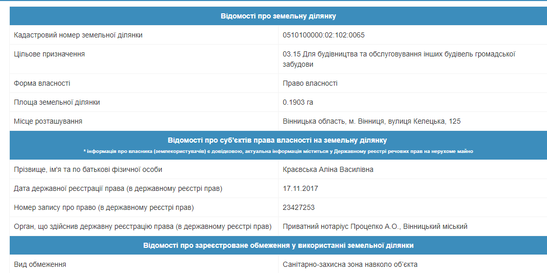 Згідно інформації з держгеокадастру України Аліна Краєвська стала власницею земельної ділянки у майже 20 соток лише в листопаді 2017 року.