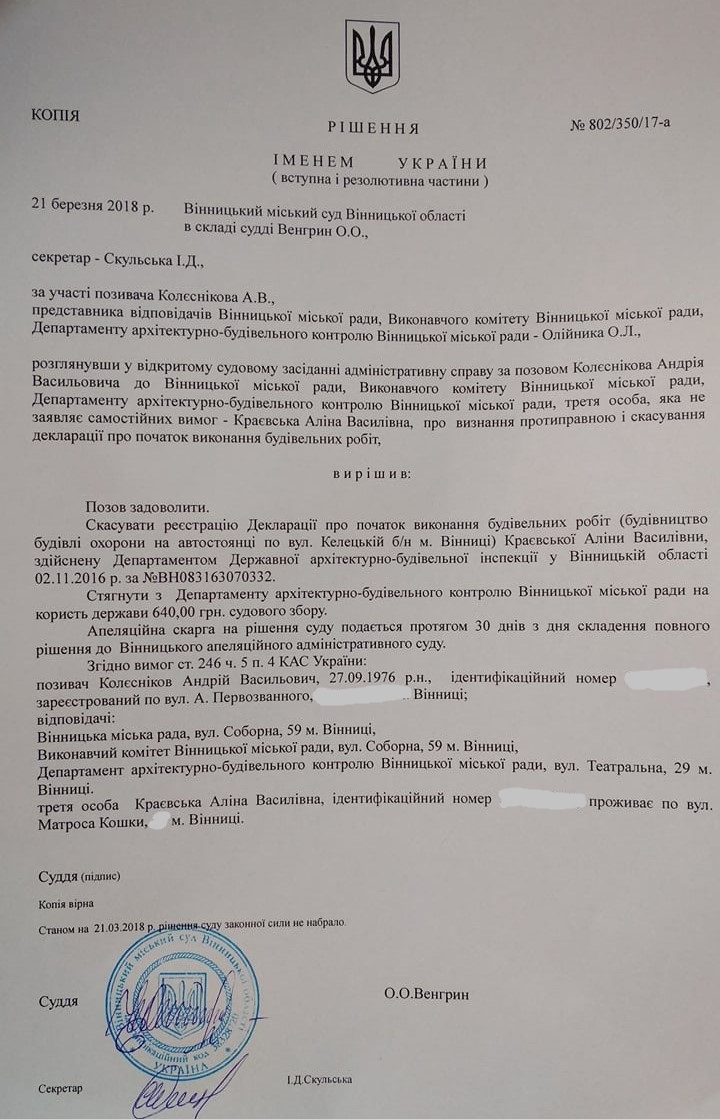 Вінницький міський суд задовольнив позов у першій інстанції вінничанина Андрія Колєснікова проти міської ради та зобов’язав визнати протиправною і скасувати декларацію про початок будівельних робіт будівлі охорони на автостоянці (на вул. Келецькій) Краєвської Аліни Василівни. Таке рішення винесла 21 березня 2018 року суддя вінницького міського суду Оксана Венгрин за позовом вінничанина Андрія Колеснікова до трьох відповідачів – Вінницької міськради, її Виконкому та департамента будівельного контролю Вінницької міськради.
