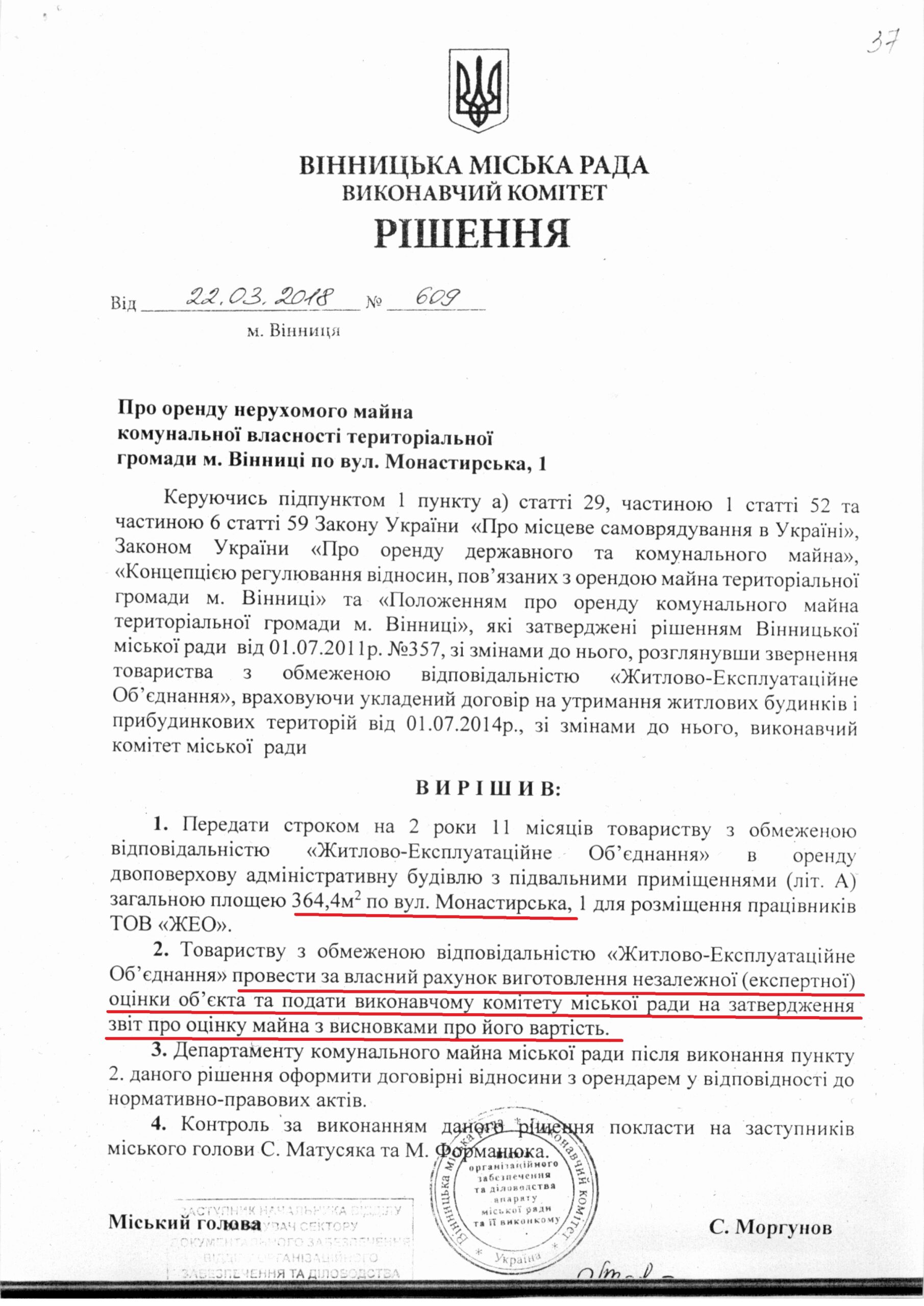 Закинуту будівлю колишнього ЖЕКу по вулиці Монастирська, 1, віддадуть в оренду ТОВ «ЖЕО». Таким було рішення виконкому №609 від 22 березня 2018 року. У рішені йдеться про те, що ТОВ ЖЕО отримує будівлю в оренду строком на два роки 11 місяців. Це двоповерхова адміністративна будівля площею 364, 4 квадратних метри. Нагадаємо, що попередній договір оренди на будівлю де-юре закінчився ще в листопаді 2017 року. А стояла вона порожньою уже більше року. Про це журналісти дізналися у ході проведення розслідування «У центрі Вінниці дореволюційний маєток влада перетворила на закинутий склад».