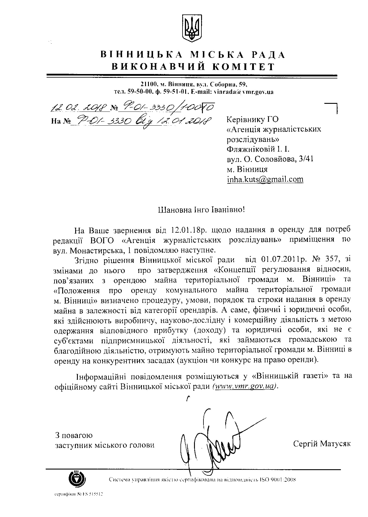 Після цього ми вирішили провести соціальний експеримент та попросити це приміщення в оренду під потреби редакції. У відповідь на офіційне звернення нам відмовили, за підписом заступника міського голови Сергія Матусяка, посилаючись на те, що отримати цю будівлю в оренду можна лише через аукціон. Порадили слідкувати за оголошеннями про оренду приміщень на офіційному сайті Вінницької міської ради. Відповідь надійшла 12 лютого. А уже 22 березня без жодних оголошень про конкурс та аукціон, будівлю передали в оренду ТОВ «ЖЕО» . Як таке могло статись? У відповідь на запит розпорядник інформації Вінницької міської ради та виконкому Ірина Єлізарова повідомила, що виявляється, відповідно до «Концепції регулювання відносин , пов’язаних з орендою майна територіальної громади міста Вінниці» приватні суб’єкти господарювання , які здійснюють діяльність по обслуговуванню житлового фонду та прибудинкових територій, отримують майно в оренду без аукціону.