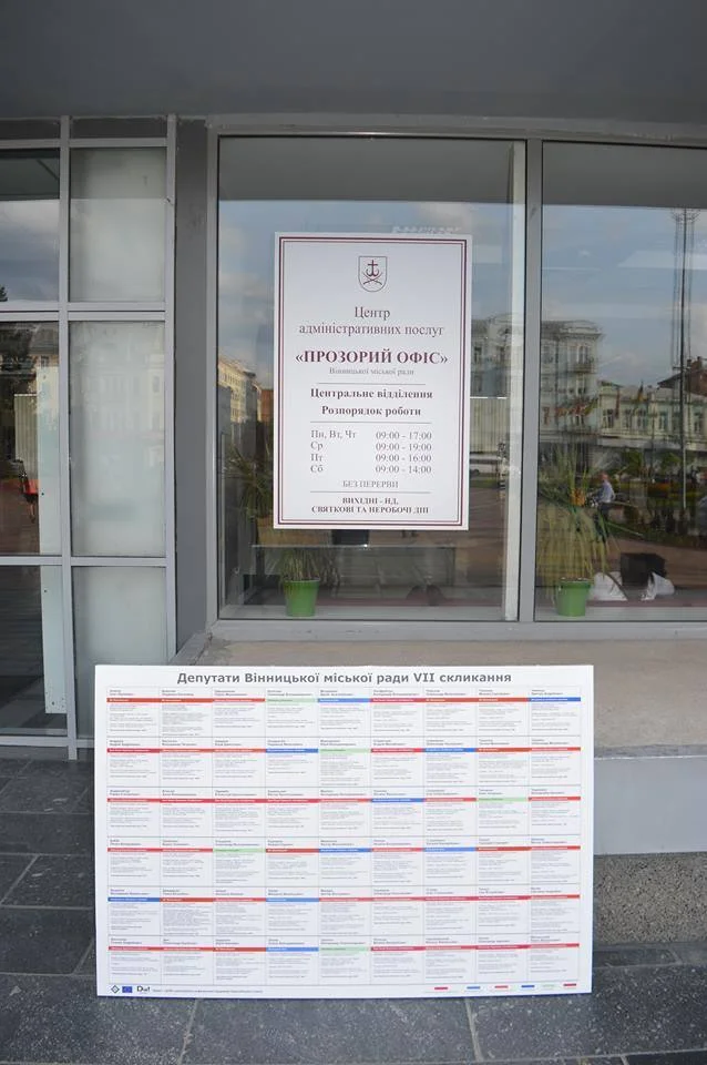Вчора, 25 квітня, «ДІЙ!-Вінниця» передав до Вінницької міської ради подарунок – стенд з контактною інформацією, інформацією про виборчі округи, місця та часи прийому, помічників та партії усіх депутатів міської ради.