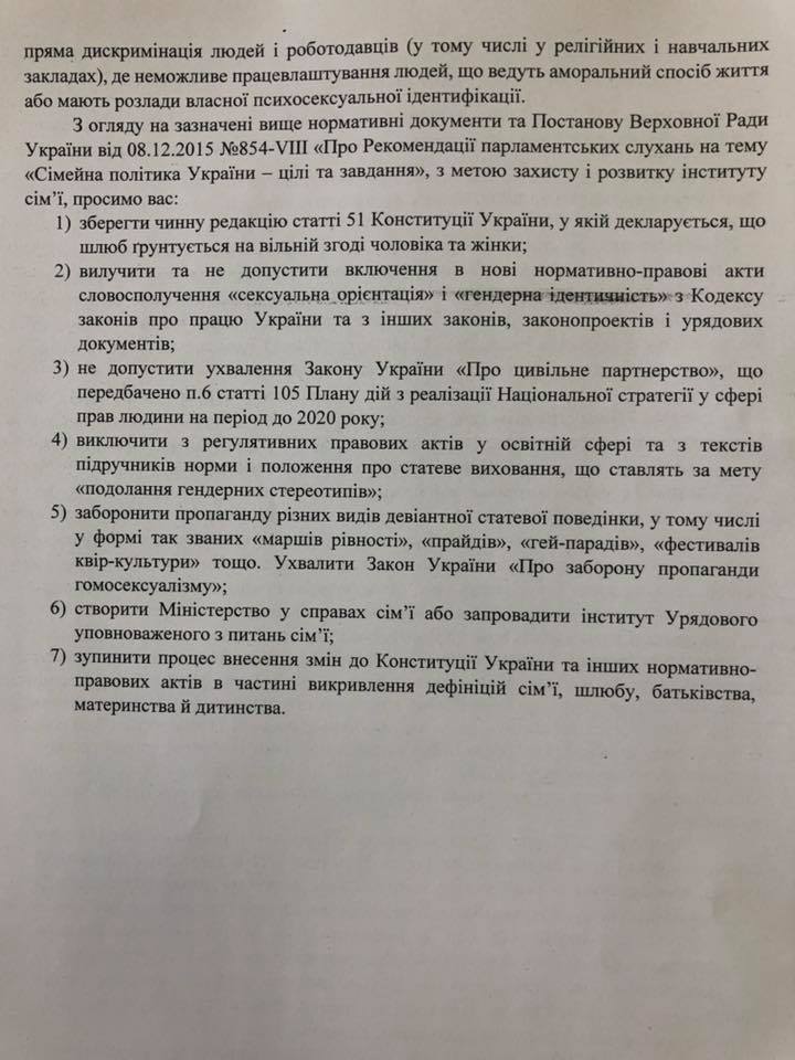 У зверненні зазначено сім вимог до вищезазначених адресатів, серед яких “заборона так званих «маршів рівностей», «прайдів», «гей-парадів», «фестивалів квір-культури» тощо», ухвалення Закону України «Про заборону пропаганди гомосексуалізму», не допущення ухвалення Закону України «Про цивільне партнерство», що передбачено у «Плані дій з реалізації Національної стратегії у сфері прав людини на період 2020 року», створення Міністерства у справах сім’ї, або запровадження інституту Урядового уповноваженого з питань сім’ї, Також міська рада просить вилучити та не допустити включення у нові нормативно-правові акти словосполучення «сексуальна орієнтація» і «гендерна ідентичність» з Кодексу законів про працю України та з інших законів, законопроектів і урядових документів”. У зверненні також вказано, що «у листопаді 2015 року уряд затвердив «План дій з реалізації національної стратегії у сфері прав людини на період до 2020 року». Цей документ є дорожньою картою для адаптування до українського законодавства до деяких негативних стандартів Європейського союзу. Зокрема, план передбачає легалізацію так званого цивільного партнерства для одностатевих пар, проведення так званих «маршів рівності» та інших видів пропаганди гомосексуалізму за державної підтримки».