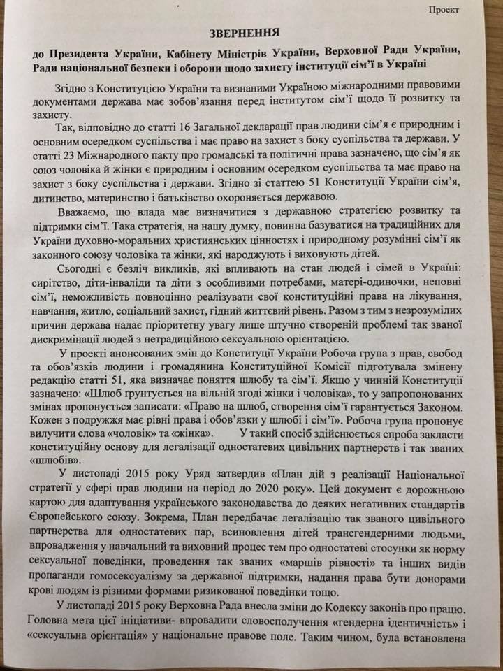 2 травня 2018 Вінницька міськрада направила підписане заступником міського голови Сергієм Тимощуком звернення до Президента України, Кабінету Міністрів України, Верховної Ради України та Ради національної безпеки та оборони щодо захисту інституції сім’ї в Україні.  Про це журналістам Агенції повідомила начальник відділу звернень міської ради та її виконкому Ірина Єлізарова у відповіді на інформаційний запит.