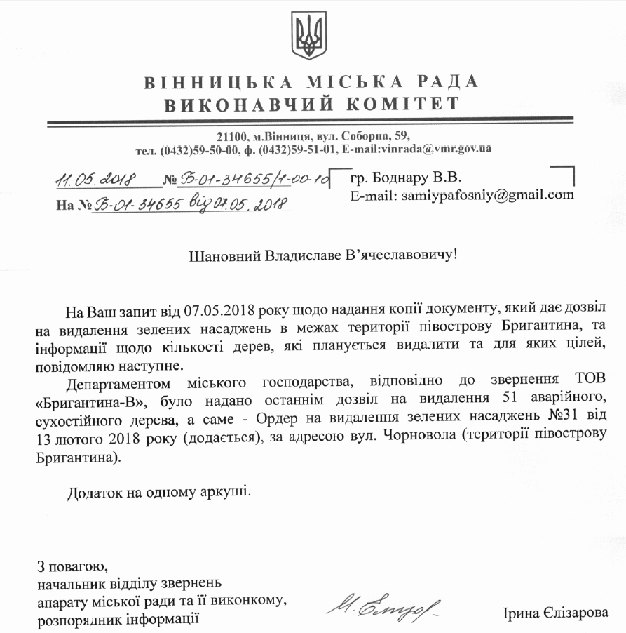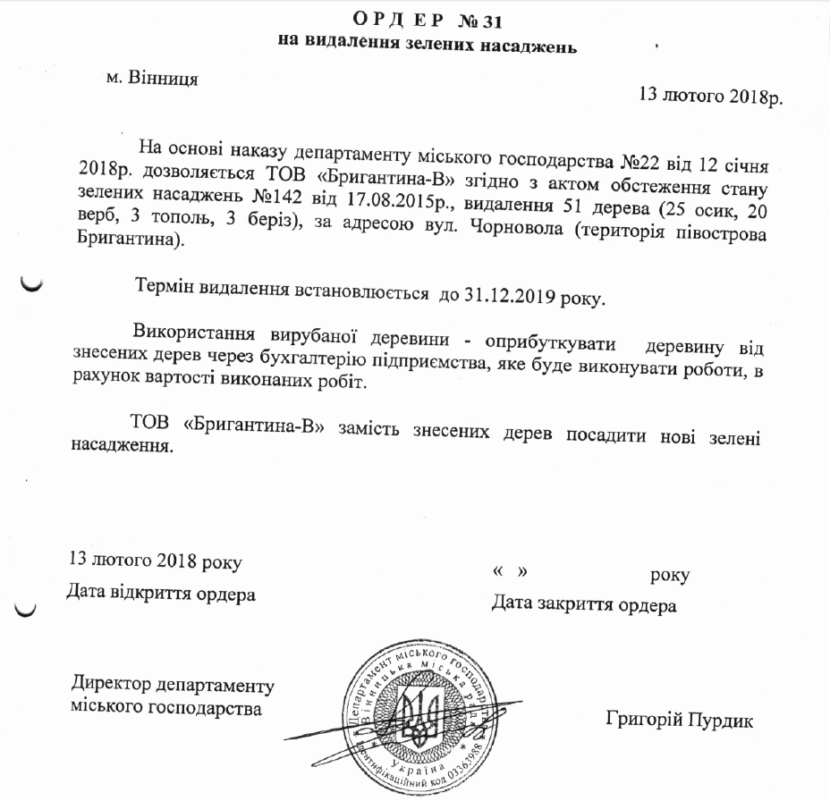З відповіді міської ради на наш інформаційний запит, ми дізнались, що після звернення ТОВ “Бригантина-В” (саме ця компанія планує тут будуватись), департамент міського господарства дав дозвіл цій компанії на видалення 51 аварійного, сухостійного дерева