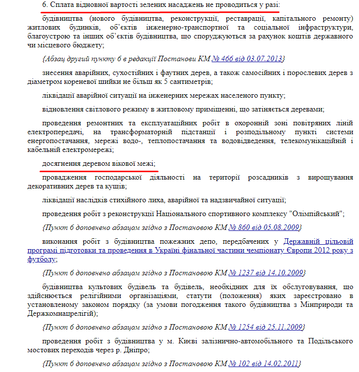 У шостому пункті цієї постанови вказується, що можна не сплачувати відновну вартість зелених насаджень, якщо дерева досягли вікової межі. Під цей пункт може підпадати ця вирубка, але не стовідсотково, тому що дерева були там різного віку.