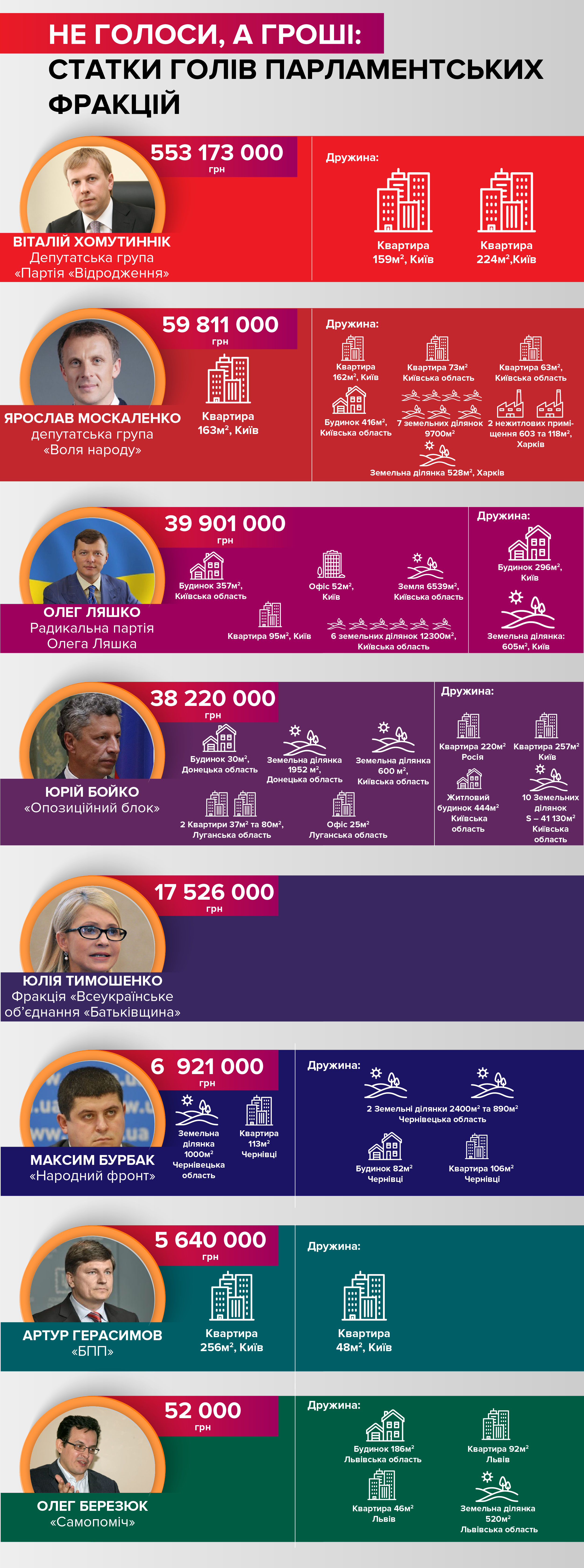 Найбагатшим серед голів парламентських фракцій та груп виявився Віталій Хомутиннік. Родом з Макіївки. У минулому – регіонал, зараз керівник депутатської групи «Відродження». З нерухомості у Віталія Юрійовича у власності тільки машиномісце. Дві квартири має дружина Світлана. Ще у неї маєток в оренді. Авто теж задекларовано небагато: по одній іномарці у власності Віталія та дружини.