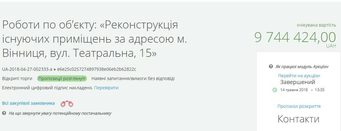 Департамент будівництва, містобудування та архітектури Вінницької обласної державної адміністрації оголосив тендер, на реконструкцію існуючих приміщень за адресою м. Вінниця вул. Театральна, 15 на суму близько 10 мільйонів гривень. За умовами тендеру, роботи мають виконати до 31 грудня 2018 року.