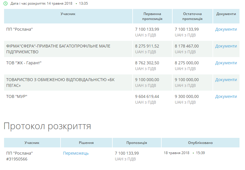 У тендері приймали участь 5 підприємств. Переможцем стало ПП «Рослана», яке запропонувало найменшу суму, трохи більше семи мільйонів гривень.