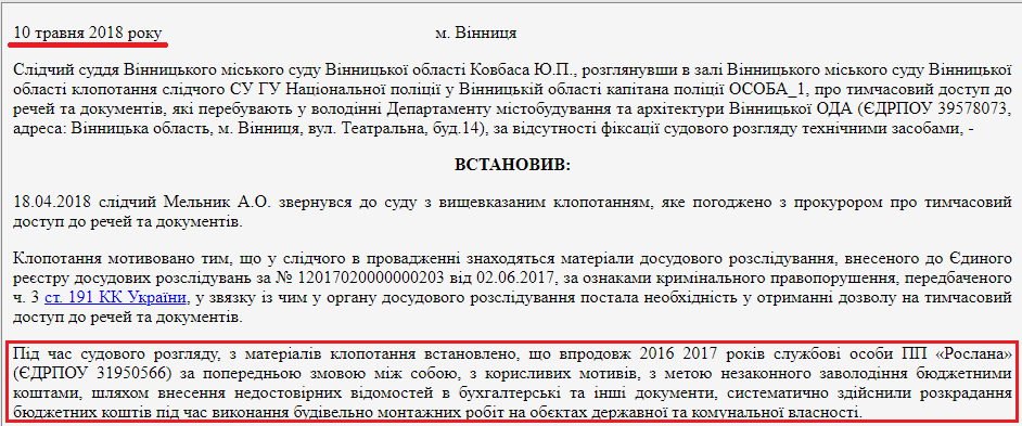 Із судової ухвали Вінницького міського суду від 12 березня 2018 року бачимо, що нещодавно слідчі Головного управління Національної поліції клопотали про накладення арешту на документи, які були вилучені у ході проведення обшуку за місцем проживання головного інженера ПП «Рослана».