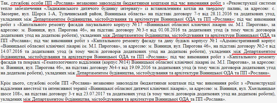 У судових документах, журналісти знайшли інформацію проте, що у ході досудового розслідування було встановлено, що службові особи ПП «Рослана» незаконно заволоділи бюджетними коштами під час виконання робіт: із встановленням котлів на твердому паливі «Ладижинського дитячого будинку інтернату», капітального ремонту фасадів та даху лікувального, гематологічного та адміністративного корпусів лікарні ім. М.І. Пирогова, реконструкції відділення анестезії та інтенсивної терапії «Вінницької обласної дитячої клінічної лікарні», укладених між Департаментом будівництва, містобудування та архітектури Вінницької ОДА та ПП «Рослана».