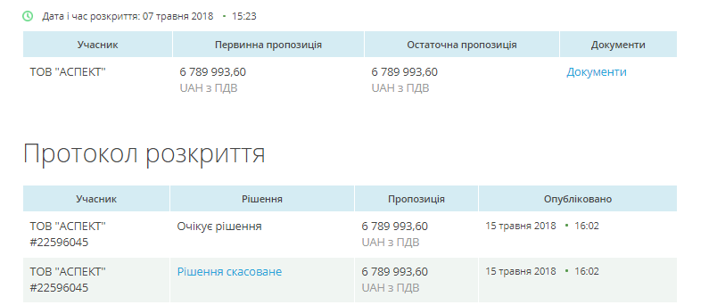 Підприємство вже очікувало рішення тендерного комітету. Втім, організатор торгів скасував закупівлю із очікуваною вартістю у