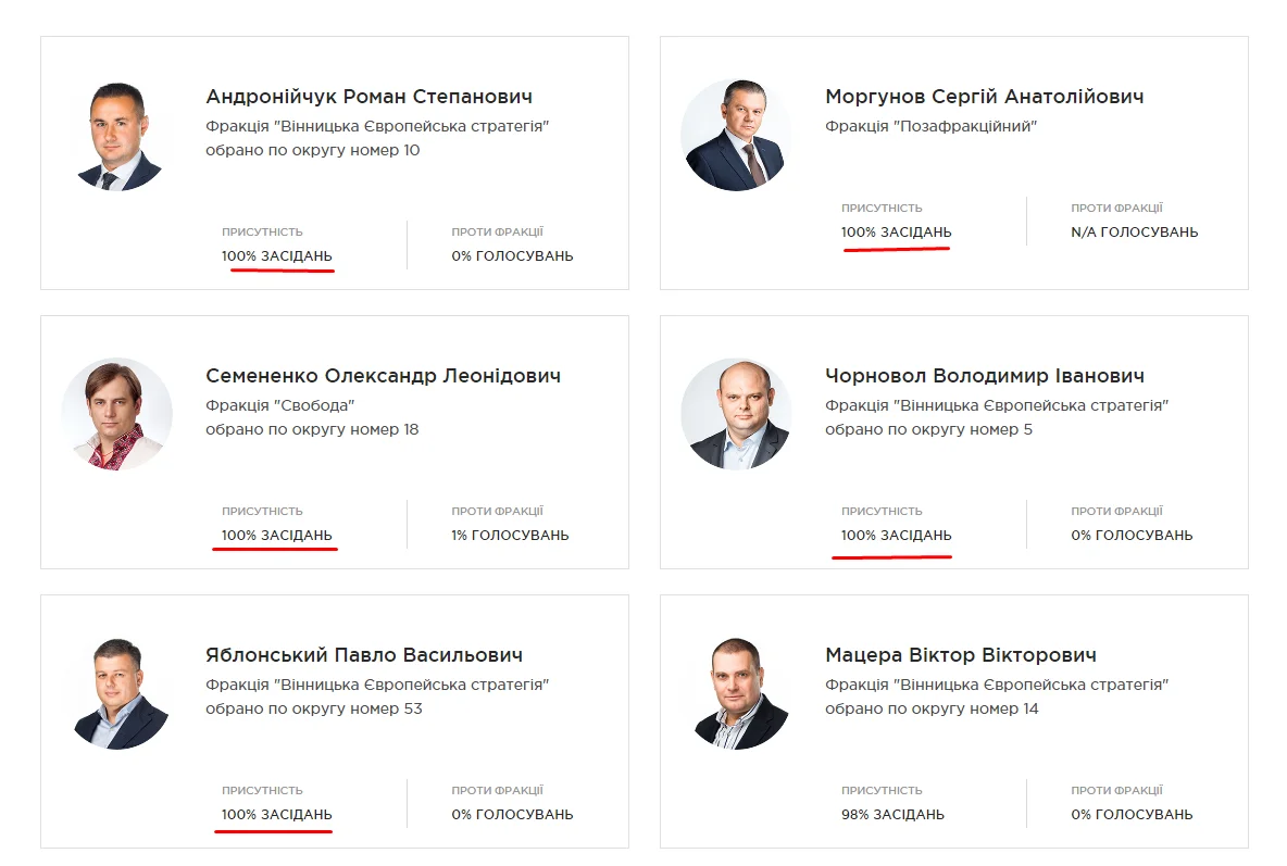 На сайті в алфавітному порядку розміщується інформація про всіх депутатів Вінницької міської ради. Навіть не заходячи у профіль, ми одразу бачимо з якої фракції та з якого округу депутат, його присутність на сесіях та як він голосує порівняно зі своєю фракцією.