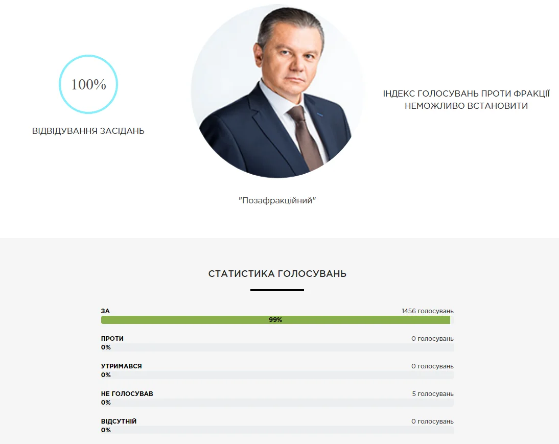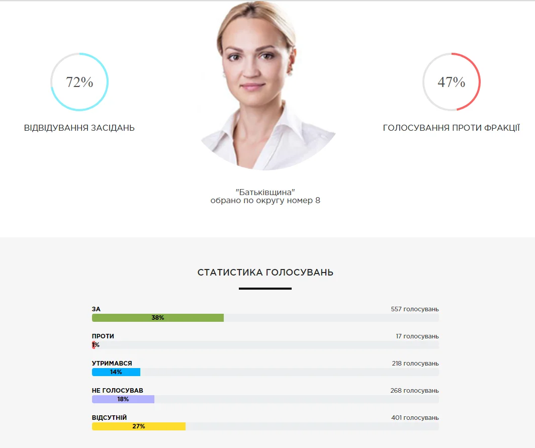 Найчастіше не так, як інші депутати її фракції, у 47 відсотках випадків, голосує депутатка Ганна Давиденко.