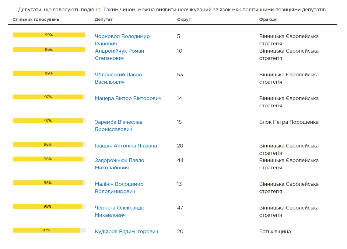 Наприклад, депутати з фракції «Вінницька європейська стратегія», які завжди голосують дотримуючись партійної лінії: Роман Андронійчук, Петро Бабій, Павло Задорожнюк, Володимир Малінін, Віктор Мацера, Володимир Чорновол, Павло Яблонський
