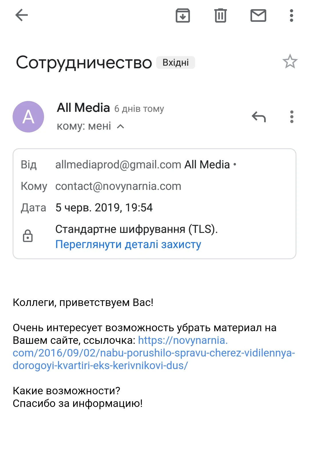Анонімні особи з адреси [email protected] були зацікавлені в тому, щоб (імовірно, за хабар) зняти згадану новину з архіву сайту.