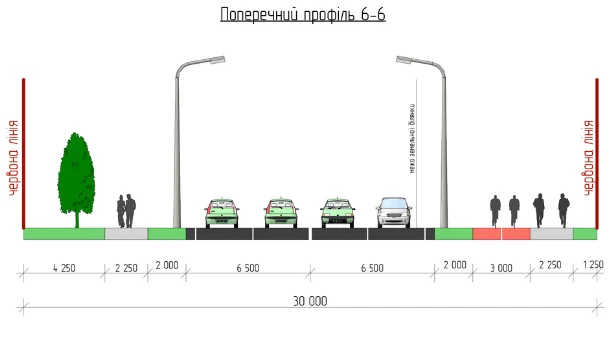 Як виглядатимуть поперечні профілі вулиць на даній території, можна побачити у графічних матеріалах, що містяться у повідомленні про обговорення. Відповідно до них ширина вулиць в межах червоних ліній становитиме 30, 40 і 60 метрів. Проектом також передбачено будівництво велодоріжок і пішохідних зон, а також висадка зелених насаджень вздовж доріг. Ширина смуги руху на деяких ділянках проїжджої частини сягатиме 3,75 см. Саме цей нюанс вже був приводом для дискусій під час громадських слухань  щодо будівництва шляхопроводу від вулиці Батозької до вулиці Максима Шимка. Тоді один з учасників слухань звернув увагу присутніх на введення в дію нових державних будівельних норм в межах населених пунктів і зазначив, що смуги руху завширшки понад 3,25 метра вважаються зонами підвищеної небезпеки, оскільки це призводить до підвищення швидкості руху транспортного потоку.
