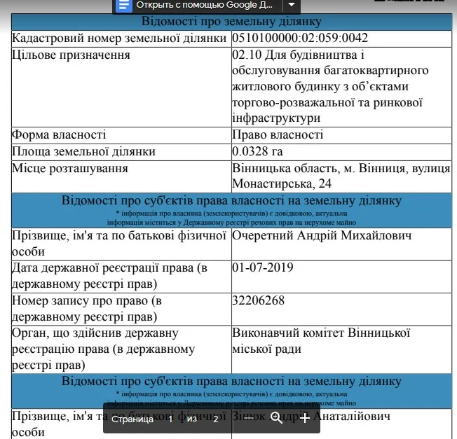 На останній сесії червня 2019 року вінницькі депутати своїм рішенням затвердили проект землеустрою щодо відведення земельної ділянки по вулиці Монастирська, 24. Вони передали громадянину Зінюку Андрію Анатолійовичу та Очеретному Андрію Михайловичу у власність земельну ділянку площею 0,0328га для будівництва і обслуговування багатоквартирного житлового будинку з об’єктами торгово-розважальної та ринкової інфраструктури, за рахунок земель комунальної власності. Земельну ділянку віднесли до категорії земель: землі житлової та громадської забудови. 1 липня вказані громадяни уже зареєстрували право власності на земельну ділянку.