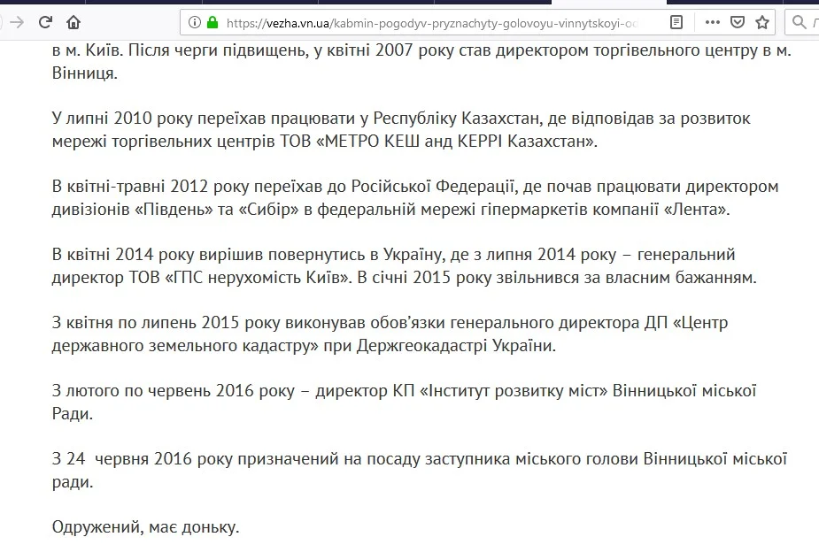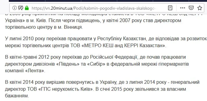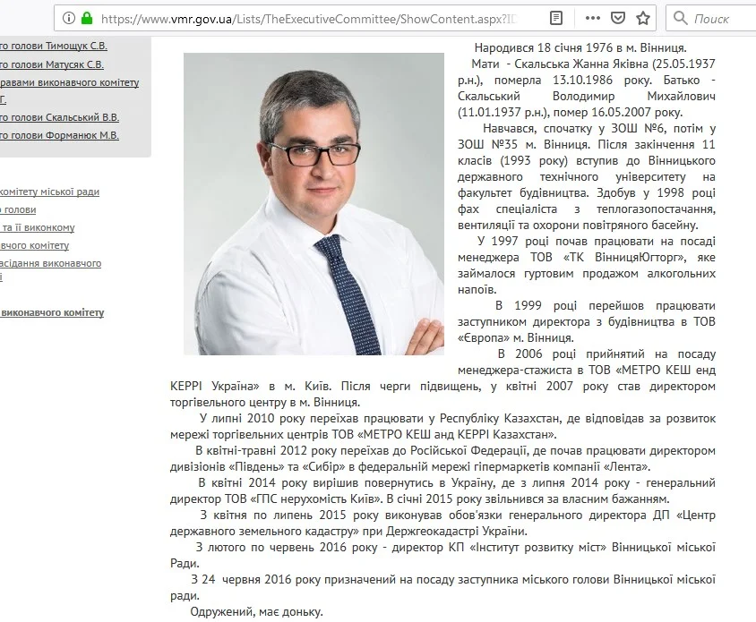 Раніше у біографії заступника Вінницького міського голови Владислава Скальського значилось, що він в квітні-травні 2012 року переїхав до Російської Федерації, де почав працювати директором дивізіонів «Південь» та «Сибір» в федеральній мережі гіпермаркетів компанії «Лента». В Україну повернувся лише у квітні 2014 року.