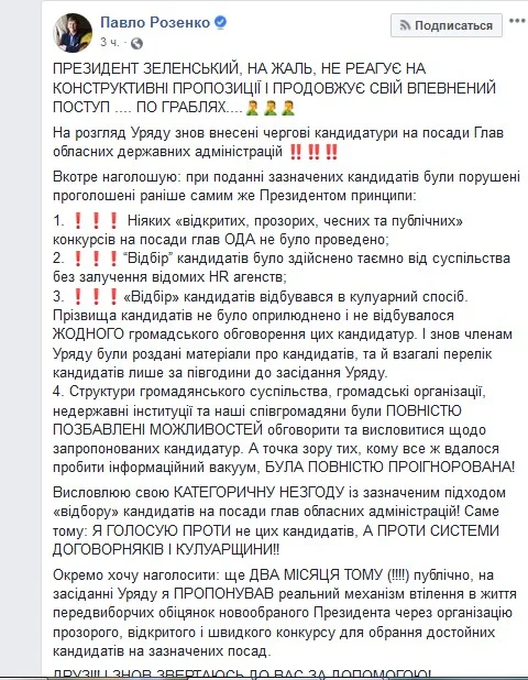 На посаду голови Вінницької ОДА запропонований Владислав Скальський, Запорізькій – Віталій Туринок і Рівненській – Віталій Коваль.Раніше в середу віце-прем’єр України Павло Розенко висловив обурення, що при подачі цих кандидатур на розгляд Кабміну не були проведені відповідні конкурси. За його словами, відбір кандидатів відбувався кулуарним способом і без громадського обговорення.