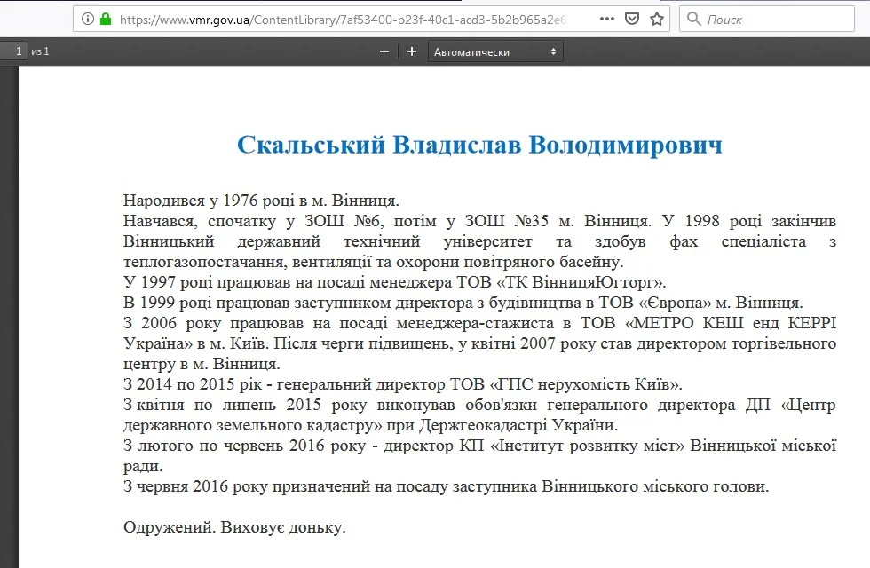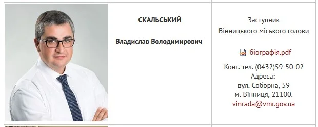 Сьогодні цього рядка у біографії Владислава Скальського на сайті Вінницької міської ради у розділі склад виконавчого комітету уже немає, якщо скачати PDF-файл з його біографією.