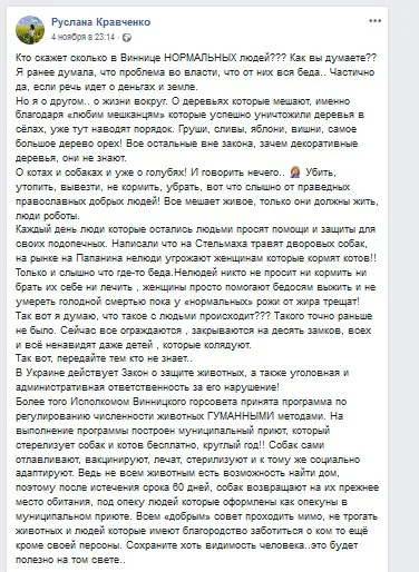 Часто волонтери у соцмережі Фейсбук в групах, які опікуються безпритульними тваринами(ВІННИЦЯ ДОПОМОГА БЕЗПРИТУЛЬНИМ ТВАРИНАМ, Винницкий приют для бездомных собак “Планета” , База найденных и потерявшихся животных – ВИННИЦА-), повідомляють про випадки масового отруєння безпритульних тварин, випадки ДТП з постраждалими та залишеними помирати тваринами, викинутими на смітники та вулиці на смерть безпорадними кошенятами та щенятами, залишеними без їжі та води тваринами у закритих приміщеннях. Зоозахисники скаржаться, що винних ніхто не розшукує і не карає, навіть попри заяви до поліції. При цьому на вулицях міста встановлено близько тисячі камер відео спостереження, що фіксують у тому числі злочини, що стосуються жорстокого поводження з тваринами.