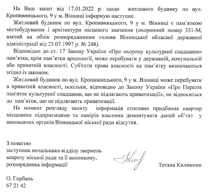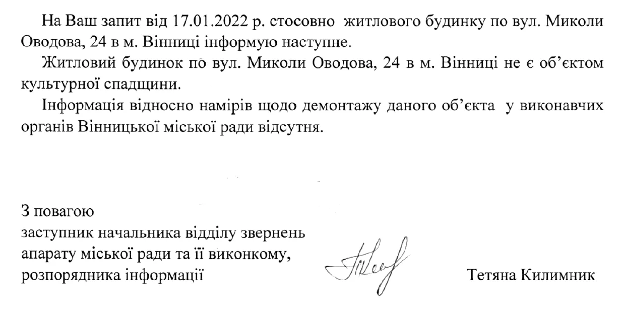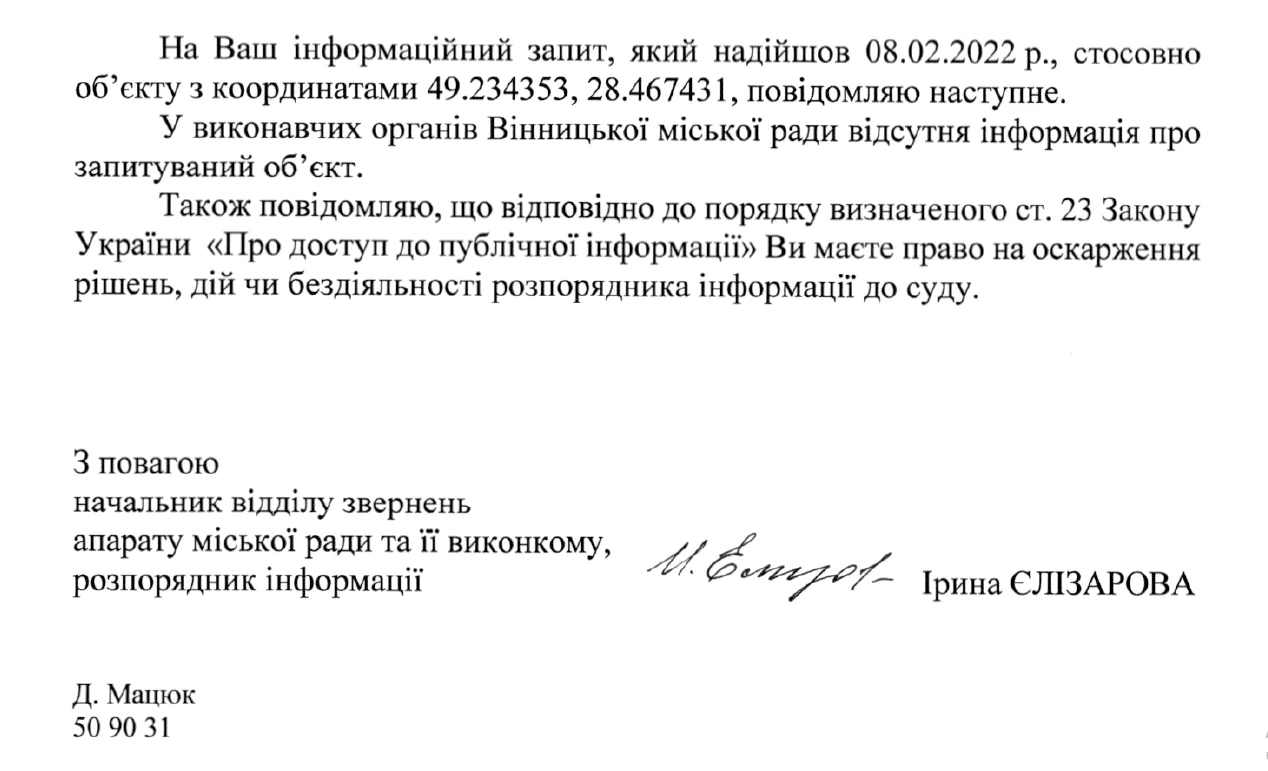 Вінницька міська рада зробила вигляд, що цієї будівлі взагалі не існує і “це нам щось примарилось”, хоча разом із запитом ми надіслали фото будівлі