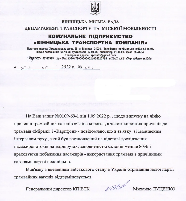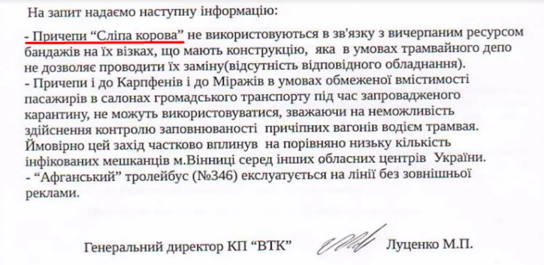 Йшли роки, а “сліпі корови” так й залишалися в сліпій зоні для мешканців Вінниці. В січні 2021 року наша Агенція надсилала запит до КП “Вінницької транспортної компанії”, щоб нам пояснили в чому справа. У відповідь нам зазначили, що випуск “сліпої корови” на маршрут неможливо з технічних причин.