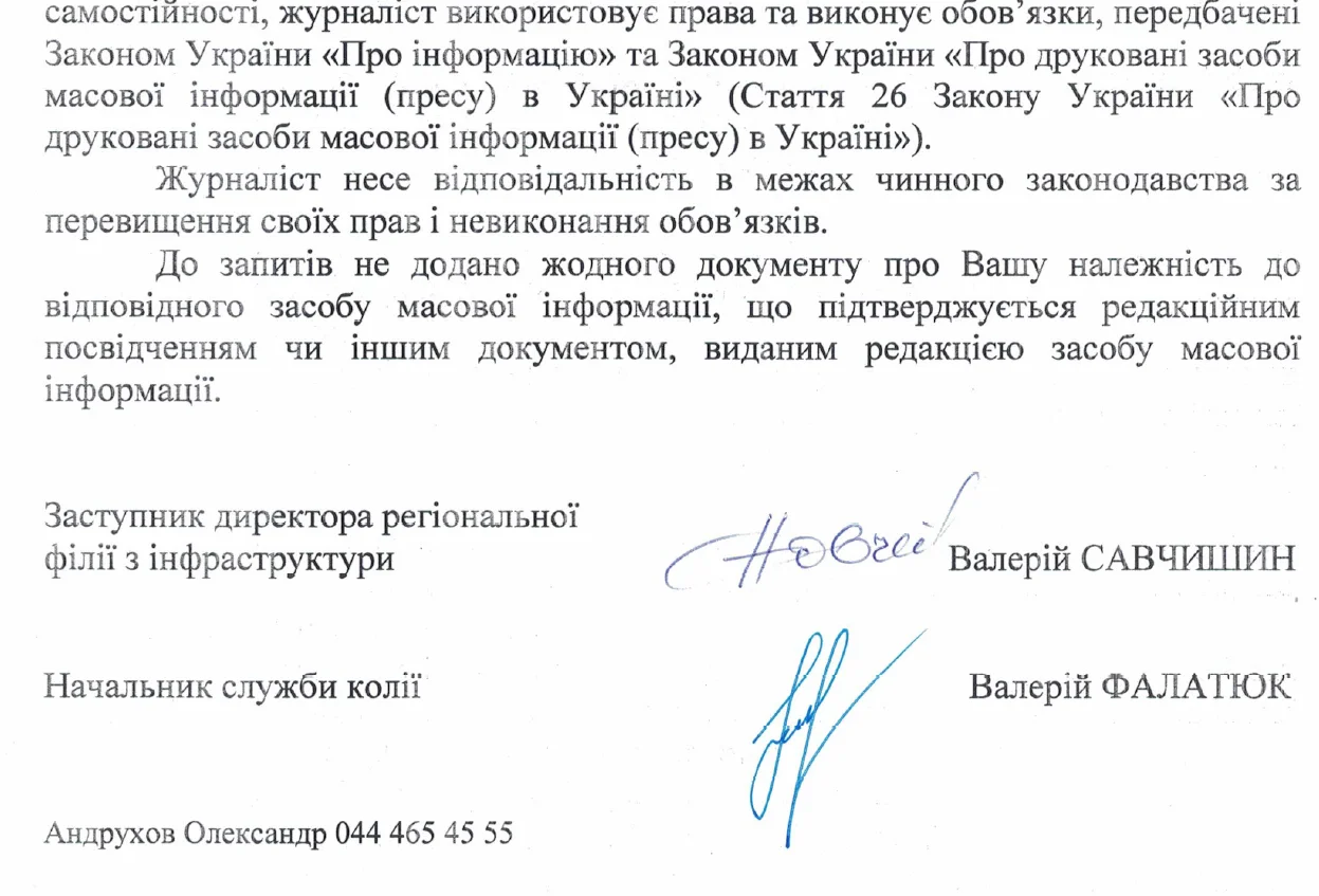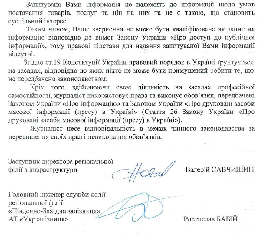 Відповідно до ЗУ «Про доступ до публічної інформації» цього не потрібно робити, але щоб не витрачати час на суперечки, ми надіслали повторний запит з копіями запитуваних документів. Але й на цей раз  відповіді по суті запиту ми не отримали. На думку службових осіб підприємства, дана інформація не представляє суспільного інтересу.