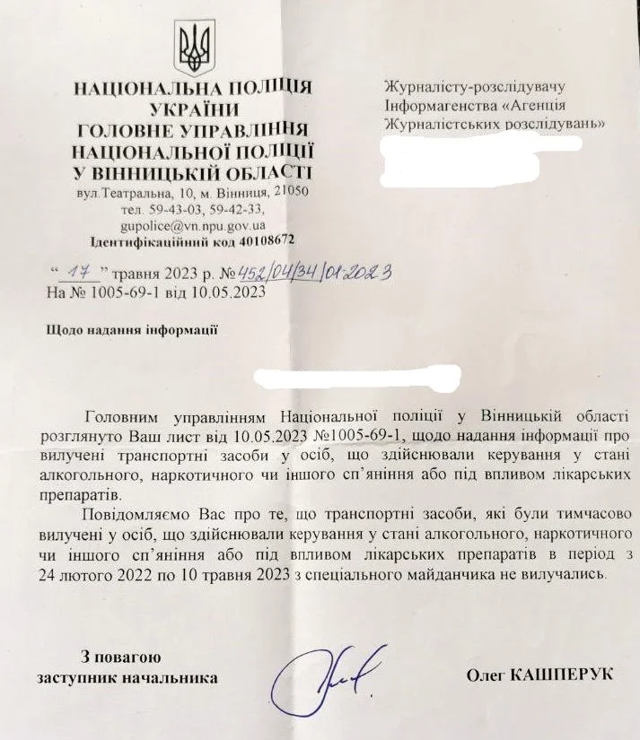 З цим питанням ми звернулись до Головного управління національної поліції у Вінницькій області. У відповідь на наш запит управління поліції зазначило, що під час дії воєнного стану в регіоні, автівки з спеціального майданчика на користь ЗСУ не вилучались.