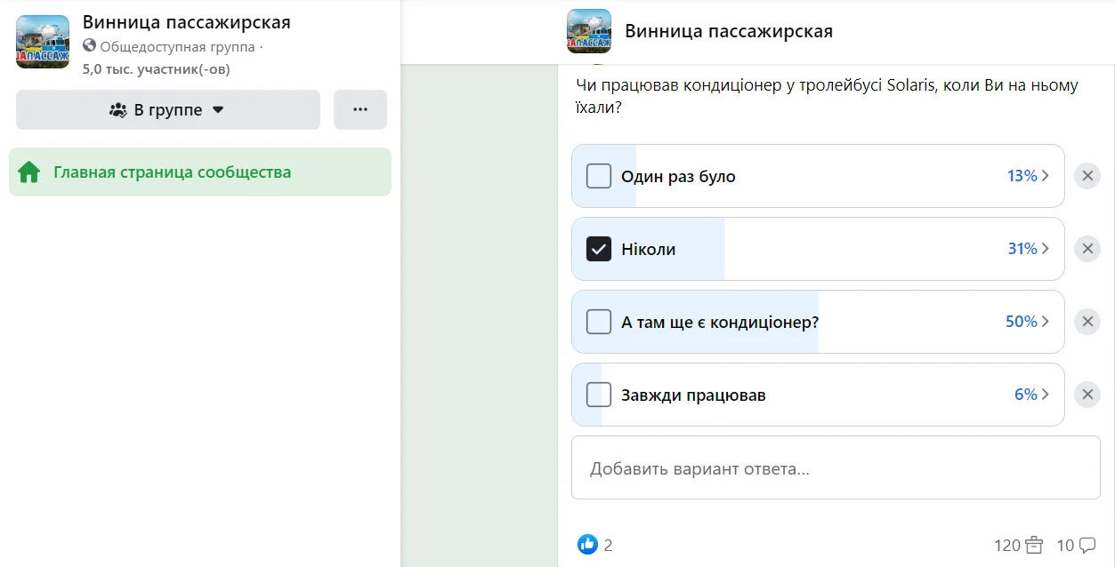 Але у спеку робота кондиціонеру у салоні польського тролейбуса майже не відчутна. Ми провели відповідне опитування в групі “Вінниця пасажирська” у фейсбуці, в якому прийняло участь 120 осіб. Переважна кількість опитаних людей не помітили роботу кондиціонера у салоні цього громадського транспорту.