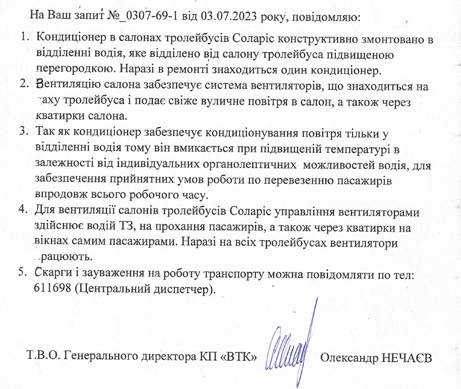 Надіславши запит до КП “Вінницька транспортна компанія”, журналісти Агенції з’ясували в чому причина непрацюючих кондиціонерів в салоні Solaris – їх там просто немає, вони встановлені тільки у відділенні водія.