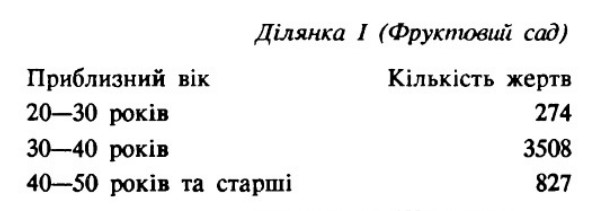 На цій ділянці розміром приблизно 100 на 60 метрів у 39 братських могилах було знайдено 5 644 тіла, з яких 53 – жіночі.