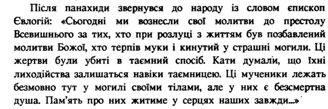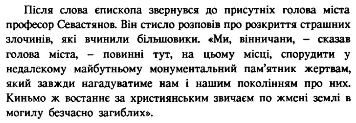 Після єпископа слово взяв тодішній очільник міста профессор Севостьянов, який сказав, що вінничанам треба буде у недалекому майбутньому спорудити тут меморіальний пам’ятник, щоб не померла пам’ять про цих людей.
