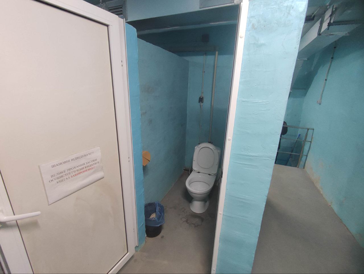 Через велику кількість людей, які можуть одночасно перебувати в укритті, було облаштовано 19 туалетів + 1 для людини з інвалідністю.