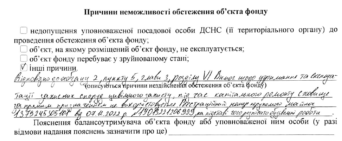 У лютому 2025 року працівники ДСНС проводили огляд цього укриття і вони в Акті обстеження об’єкта написали наступне: