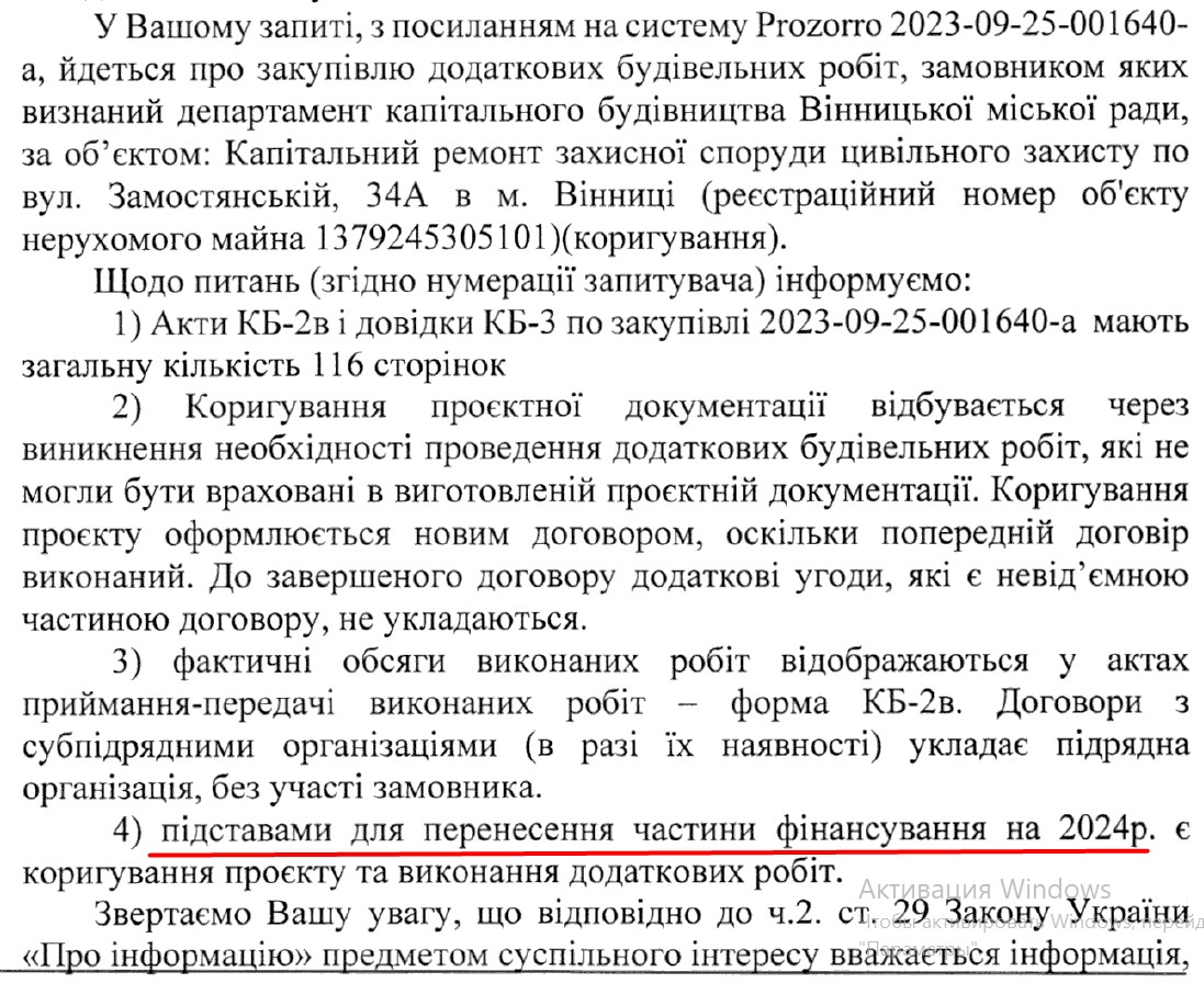У відповіді на більшість запитів щодо укриття на Замостянській, 34а, Вінницька міська рада повідомляла, що запитувана інформація не є такою, що становить суспільний інтерес.