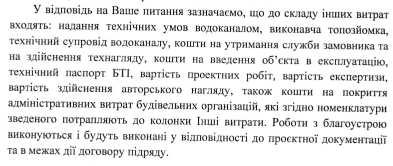 У відповідь на наш запит, Вінницька міська рада вказала що саме мається на увазі під статтею витрат “інші витрати”. Також зазначили, що роботи по благоустрою ще виконуються.