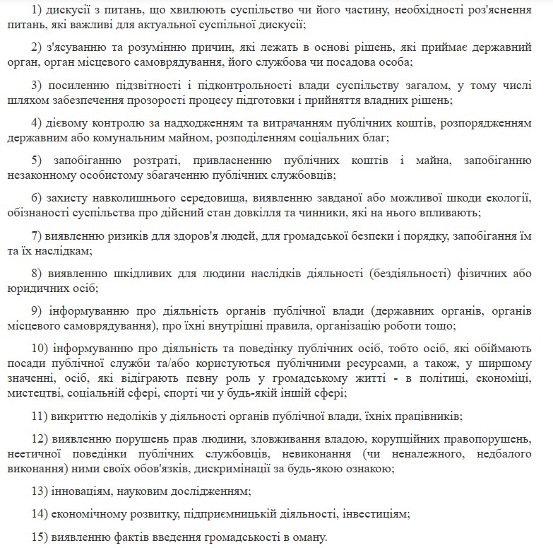 Вищий адміністративний суд України у Постанові роз’яснив наступне: “…оцінюючи конкретну інформацію на предмет наявності суспільного інтересу до неї, суди повинні застосовувати певні критерії. Так, наприклад, інформація може вважатись суспільно необхідною, якщо її поширення сприяє:”