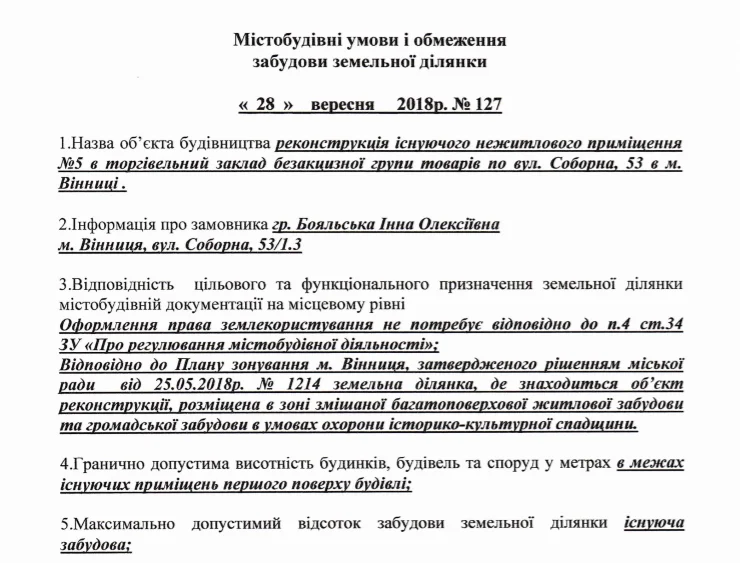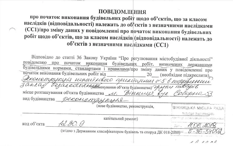 Для роз’яснення ситуації Центр надіслав запит щодо доступу до публічної інформації, у відповідь на який отримали копію повідомлення про початок будівельних робіт 14 квітня 2019 року, замовником яких виступає громадянка Бояльська Інна Олексіївна. В акті йдеться про те, що на вказаному місці відбувається реконструкція нежитлового приміщення №5 в торговельний заклад безалкогольної групи товарів. Вид будівництва в документі названо реконструкцією. Загальна площа об’єкту має скласти 15,2 квадратних метри, об’єм приміщення – 44 кубометри. Воно розраховане на одне робоче місце.
