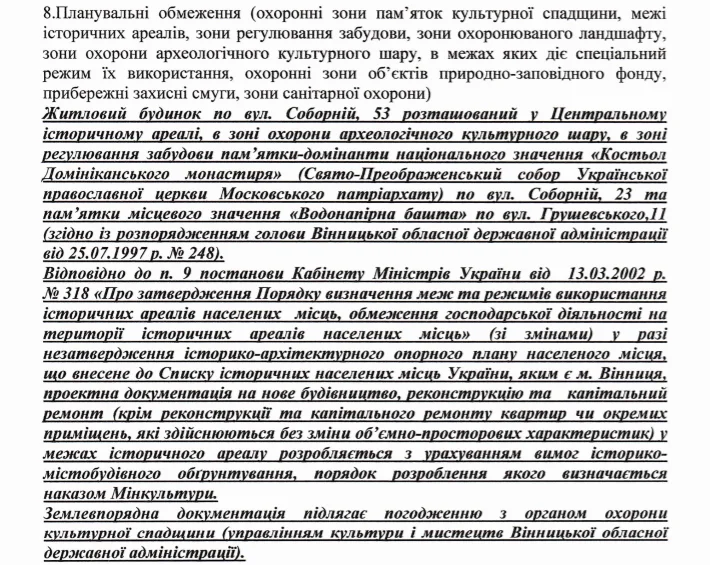 У акті сказано, що підтверджуючі документи, які дають право на користування земельною ділянкою не вимагаються згідно пункту четвертого статті 34 Закону України Про регулювання містобудівної діяльності. У цьому пункті йдеться, що реконструкція, реставрація або капітальний ремонт об’єктів будівництва без зміни зовнішніх геометричних розмірів їхніх фундаментів у плані, на замовлення органів місцевого самоврядування на відповідних землях комунальної власності можуть здійснюватися за відсутності документа, що засвідчує право власності чи користування земельною ділянкою.