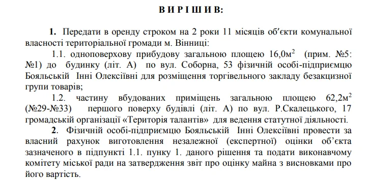 У рішенні №835 від 6 квітня 2017 року йдеться про передачу в оренду строком на 2 роки 11 місяців об’єкту комунальної власності територіальної громади міста одноповерхової прибудови загальною площею 16 метрів квадратних по вул. Соборна, 53 фізичній особі-підприємцю Бояльській Інні Олексіївні для розміщення торгівельного закладу безакцизної групи товарів.